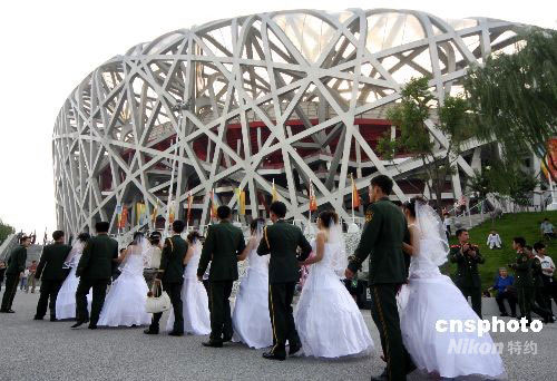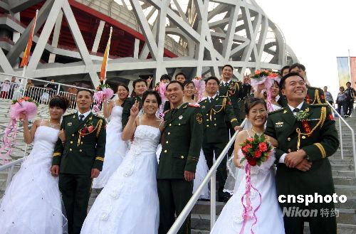 9月30,喜結(jié)良緣的奧運(yùn)安保武警與新娘在國家體育場(chǎng)“鳥巢”前集體留影。當(dāng)天,武警十三支隊(duì)21位奧運(yùn)安保武警在數(shù)次推遲婚期后,終于步入婚姻殿堂。據(jù)了解,這21位武警戰(zhàn)士從今年初開始就沒有休過一天假,原定的婚期一拖再拖,直到奧運(yùn)結(jié)束后,才定為國慶節(jié)期間完婚。中新社發(fā) 吳芒子 攝