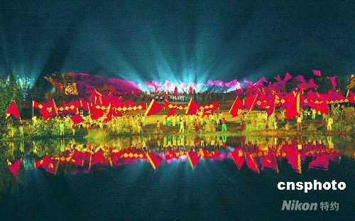 十月六日晚八時(shí),江西省首個(gè)大型戶外實(shí)景演出《井岡山》,再現(xiàn)當(dāng)年八十年前紅軍挑糧上井岡山情景。這場(chǎng)《井岡山》的演出由近千名當(dāng)?shù)剞r(nóng)民參演,采用一千多盞燈光、五萬五千多平方米的舞臺(tái)。中新社發(fā) 段長(zhǎng)征 攝