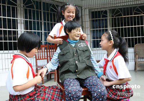 10月7日,由四川省廣安市廣安區(qū)東方小學(xué)的10多名少先隊員組成的愛心志愿者小分隊來到濃洄敬老院,看望生活在這里的40多位老人,為老人送上節(jié)日禮物,為老人打掃房間,陪老人聊天、散步,為他們送去重陽節(jié)的祝福,陪伴他們度過災(zāi)后首個重陽節(jié)。 中新社發(fā) 杜修戰(zhàn) 攝