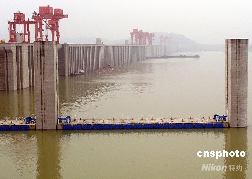 2008年10月7日,經(jīng)過近10天持續(xù)不斷地蓄水,三峽工程大壩壩前水位達(dá)到155.5米,并保持在該水位以上運(yùn)行,實(shí)現(xiàn)了2008年汛后先期蓄水至156米水位的目標(biāo),是否向175米水位抬升尚需再檢測(cè)并研究三峽大壩運(yùn)行情況、三峽庫區(qū)地質(zhì)災(zāi)害狀況等之后再做決定。按設(shè)計(jì)要求,三峽工程分135米、156米、175米三個(gè)水位進(jìn)行蓄水。此前,三峽工程已于2006年、2007年兩次蓄至156米水位高程。中新社發(fā) 劉君鳳 攝