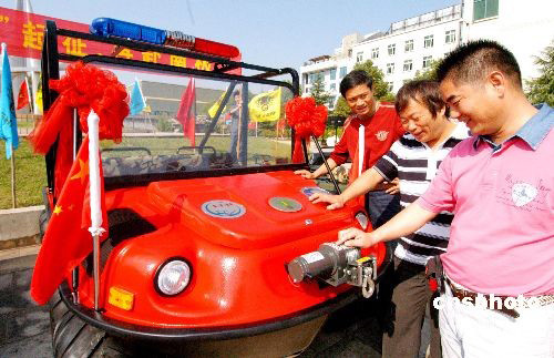 10月9日上午,一輛水陸兩棲全地型功能車交付中國南極科考隊,并將于10月20日搭乘“雪龍?zhí)枴?投入笫25次南極科學考察。這次奔赴南極笫25次科考的水陸兩棲全地型功能車,專門針對南極復雜的地形和氣候,對車體、輪胎、散熱系統、變速檔位都進行改進,裝上防冰刀扎的防爆輪胎,并增配了自動牽引鉤、牽引鋼絲繩、水上推進的螺旋槳及警示燈。中新社發(fā) 張建成 攝