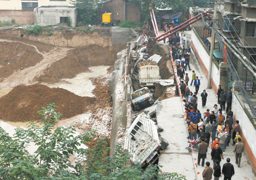 10月8日11時(shí)45分左右,位于西安市新城區(qū)長纓東路的北張家莊村里,一處長約70米的道路突然發(fā)生大面積塌陷,坍塌面積大約有300平方米,造成停放在公路上的9輛貨運(yùn)汽車瞬間掉入了深約3米的坑中。路面塌陷過程中,附近群眾都以為是地震了,遂四散逃離。該起事故沒有造成人員傷亡,塌陷原因目前正在調(diào)查當(dāng)中。