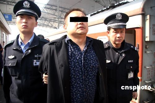 2008年10月13日,沈陽鐵路公安處乘警支隊在成都開往沈陽的北的K388列車上抓獲一名潛逃十年的殺人犯,犯罪嫌疑人池繼云是四川金堂縣人,1973年生人,1998年12月13日,他在四川省都江堰市風(fēng)行酒廊殺死2人重傷2人,十年來一直負(fù)案在逃,不想這次列車上被沈陽鐵路公安抓獲。中新社發(fā) 趙敬東 攝