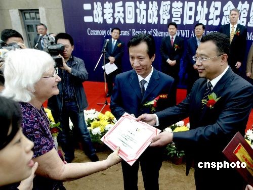 10月16日,二戰(zhàn)時(shí)期美國(guó)老兵普謝和愛(ài)德華,再次來(lái)到60多年前曾被關(guān)押的沈陽(yáng)二戰(zhàn)盟軍戰(zhàn)俘營(yíng)舊址,憑吊之際,向舊址紀(jì)念館捐贈(zèng)了一批珍貴文物史料。美國(guó)駐沈陽(yáng)總領(lǐng)事魏思文和沈陽(yáng)市政府有關(guān)官員出席了捐贈(zèng)儀式。中新社發(fā) 周紅 攝