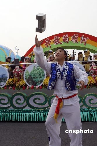 在菊花會(huì)開(kāi)幕式上具有民族特色的石鎖表演。