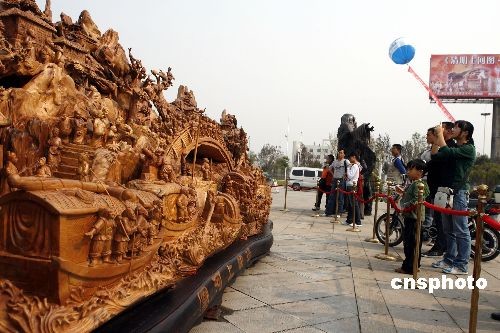 10月18日,開封展出巨型根雕《清明上河圖》。在26屆開封菊花會期間,舉辦了中國觀賞石、玉器、古玩、字畫、花卉、盆景、根雕交易會,一些平日里難得一見的珍品,紛紛亮相。來自北京的巨型香樟木根雕《清明上河圖》,材料采用東南亞熱帶香樟木,樹齡2300年。作品長18米,已經(jīng)申報吉尼斯世界紀(jì)錄。中新社發(fā) 慎重 攝