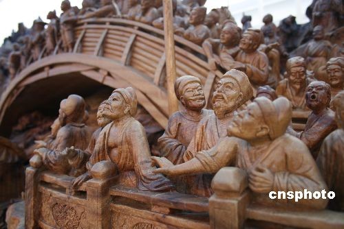 10月21日,長18米的巨型根雕《清明上河圖》在開封東京藝術(shù)中心廣場展出。據(jù)工作人員介紹,這一作品原木是一株生長在東南亞熱帶崇山峻嶺中的香樟古木,樹齡在2300年以上,樹高百米,樹干直徑4米,根徑20米,完全暴露風(fēng)干近10年。后以北宋畫家張擇端的《清明上河圖》為藍(lán)本,由福建35位藝術(shù)家和工匠歷時(shí)5年精雕細(xì)刻而成。雕刻完成后,作品長18米,高2.56米,寬2米,重12噸。 據(jù)悉,這一來自福建莆田的巨型香樟木根雕《清明上河圖》作品,已經(jīng)申報(bào)吉尼斯世界紀(jì)錄。中新社發(fā) 劉書亭 攝