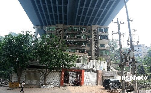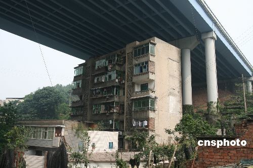 圖為重慶渝黔高速路南山立交橋下的一幢6層居民樓,此樓樓頂立交橋,背倚橋柱,在網(wǎng)上被稱為“終年曬不到太陽、淋不到雨的最牛的樓房”。而近日這棟“最牛樓房”還未拆遷,旁邊卻又要開建新房,引起了廣大市民的熱議。中新社發(fā) 孫須 攝