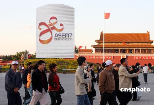10月23日,北京天安門廣場(chǎng)一派祥和,以亞歐首腦會(huì)議為主題的花壇光彩奪目,第七屆亞歐首腦會(huì)議將于10月24日至25日在京舉行,這是繼2008奧運(yùn)會(huì)后北京舉辦的一次重要的國(guó)際性盛會(huì)。中新社發(fā) 吳芒子 攝