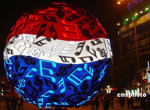 2008年10月24日晚,游客在欣賞蘇州石路步行街廣場上燈光變幻的巨型音符球。近日,蘇州石路步行街廣場上一只直徑達(dá)3米的巨型音符球亮燈。中新社發(fā) 王建康 攝