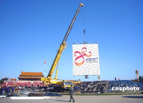 2008年10月27日上午,北京天安門廣場(chǎng),施工人員開(kāi)始吊卸第七屆亞歐首腦會(huì)議標(biāo)識(shí),整個(gè)中心花壇的拆除工作正在加緊進(jìn)行,預(yù)計(jì)將于今晚全部拆卸完畢。今年的天安門廣場(chǎng)花壇布置從7月5日開(kāi)始施工,經(jīng)歷奧運(yùn)會(huì)、殘奧會(huì)、國(guó)慶、第七屆亞歐首腦會(huì)四個(gè)時(shí)期,至今已歷時(shí)3個(gè)多月。這是自1986年廣場(chǎng)擺花以來(lái),史無(wú)前例的。中新社發(fā) 玉龍 攝