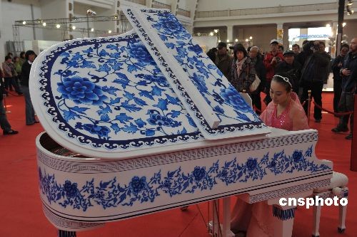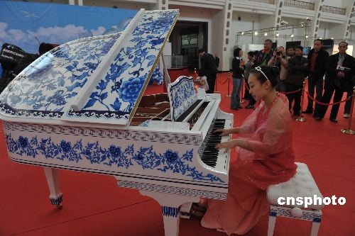 10月28日,在中國東北亞(沈陽)進(jìn)口商品博覽會(huì)上,一名少女在彈奏青花瓷鋼琴,F(xiàn)場(chǎng)的工作人員介紹說,這架名為琴瓷的鋼琴是專門為前不久舉辦的國際樂器展覽會(huì)制作的,琴身上的瓷紋是由技術(shù)人員手工雕刻而成,目前在世界上僅有這一架,市場(chǎng)售價(jià)在46.9萬元左右。中新社發(fā) 徐建國 攝