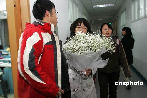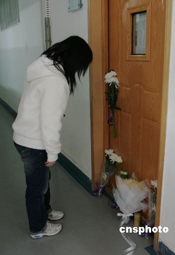 2008年10月29日下午,中國政法大學(xué)師生在事發(fā)地點(diǎn)悼念昨日遇害的程春明教授。10月28日晚,中國政法大學(xué)昌平校區(qū)內(nèi),正準(zhǔn)備上課的副教授程春明被一名大四男生砍成重傷,經(jīng)搶救無效死亡。中新社發(fā) rain 攝