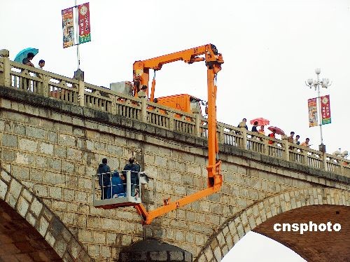 11月2日上午,廣西南寧公路局工程技術(shù)人員冒細(xì)雨為中國當(dāng)代最長的石拱橋——--龍州大橋“把脈探傷”。龍州大橋建于上世紀(jì)60年代,為七拱方塊石料結(jié)構(gòu),橋長約252米。在通車的43年來,已經(jīng)受了4次大洪水的考驗(yàn)。中新社發(fā) 馮文 攝