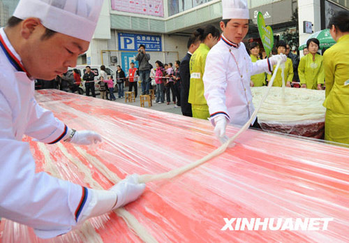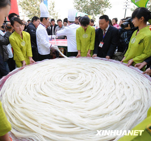 11月2日,一家方便米線生產(chǎn)廠家在鄭州街頭舉行挑戰(zhàn)最長的方便米線活動(dòng),商家展示出他們特意加工的一把113根米線,每根長420.4米。