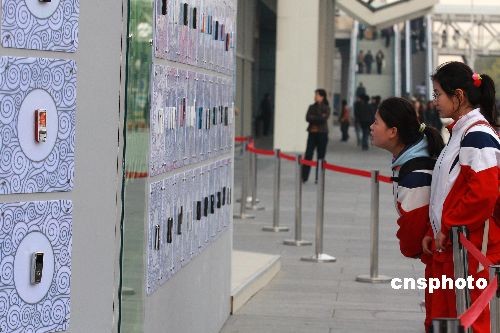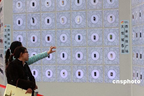 11月4日,北京西單大街,一面長約30米的手機墻引來不少路人駐足欣賞。墻面上擺放著各種品牌款式的時尚手機,讓原本時尚的西單大街更添幾分色彩。中新社發(fā) 鄭雄增 攝