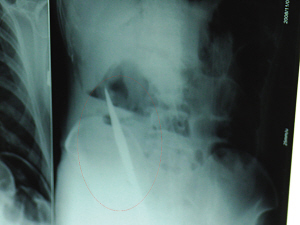 6日上午,記者在徐州礦務(wù)集團(tuán)總醫(yī)院重癥監(jiān)護(hù)室見(jiàn)到了這名男子,目前他雖然已經(jīng)恢復(fù)了意識(shí),但還不能開(kāi)口說(shuō)話,需要呼吸機(jī)輔助呼吸。據(jù)醫(yī)生介紹,4日中午12時(shí)左右,這名男子因服毒輕生被緊急送到醫(yī)院進(jìn)行搶救,之前,這名男子已經(jīng)在當(dāng)?shù)剜l(xiāng)鎮(zhèn)醫(yī)院進(jìn)行了近20小時(shí)的治療,但效果不佳!安∪吮晦D(zhuǎn)院到礦總院時(shí)已神志不清,血壓極低,處于休克狀態(tài)!本茸o(hù)人員給男子洗胃、初步處理以后,發(fā)現(xiàn)男子呼吸急促,于是趕緊給他拍片檢查。結(jié)果讓所有的醫(yī)生大吃一驚,竟有一把尖狀異物橫在該男子腹腔內(nèi)!當(dāng)天下午5時(shí)30分,輕生男子被推上了手術(shù)臺(tái)。經(jīng)過(guò)40多分鐘的手術(shù),該男子腹腔被打開(kāi),手術(shù)醫(yī)生發(fā)現(xiàn),男子體內(nèi)的金屬狀異物竟然是一把長(zhǎng)19厘米的尖刀!