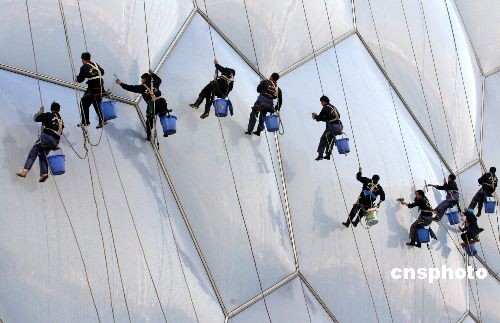 11月7日,清潔工人對“水立方”室外膜結(jié)構(gòu)進(jìn)行清洗。國家游泳中心有限責(zé)任公司相關(guān)負(fù)責(zé)人表示,這是奧運會后水立方首次全身“洗澡”。此次清洗主要是因為北京入秋后空氣中塵土較多,專業(yè)的保潔人員只是幫助水立方擦去外層附著的塵土。所以,清洗時并不需要特殊的清洗液,只要清水即可。而水立方內(nèi)部膜結(jié)構(gòu)此次并不需要清潔。中新社發(fā) 吳芒子 攝