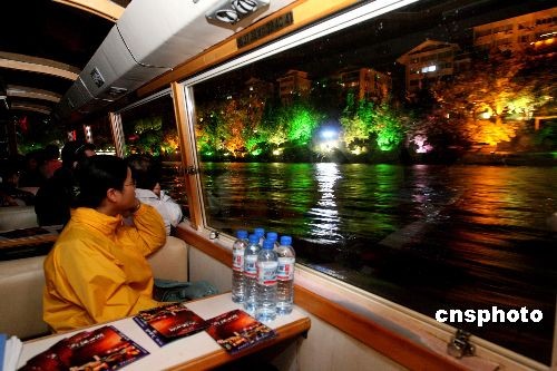 2008年桂林山水文化旅游節(jié)藝術(shù)巡游將于11月9日晚開啟序幕,眾多嘉賓云集參加多項(xiàng)活動。圖為11月8日晚,游客乘船欣賞桂林市區(qū)兩江四湖美麗夜景。中新社發(fā) 王麗南 攝