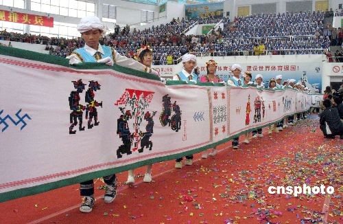 十一月八日,在世界過山瑤之鄉(xiāng)——廣東乳源舉行的四十五周年建縣華誕慶典上,該縣瑤胞向來賓展示世界最長的刺繡作品——百米“瑤嶺長歌”。中新社發(fā) 馮昶 攝