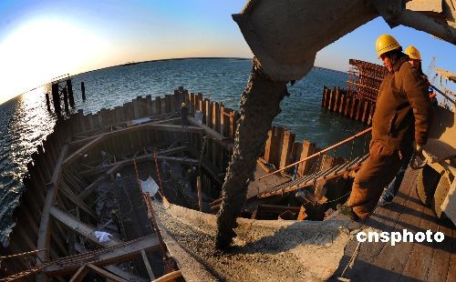 背景資料:曹妃甸特大橋是遷曹鐵路全線重點(diǎn)控制工程,全長(zhǎng)7477.26m,為雙線橋梁,包括下部結(jié)構(gòu)樁基1973根、橋墩臺(tái)243個(gè),以及相應(yīng)施工便道、筑島平臺(tái)填筑和跨1400m的納潮河段施工棧橋、平臺(tái)搭設(shè);上部結(jié)構(gòu)現(xiàn)澆4處15孔共339.44m,架設(shè)預(yù)制梁227孔?缂{潮河段水深6至18m,納潮河主跨連續(xù)箱梁施工是重中之重,原設(shè)計(jì)為(40+64+40)分段懸臂澆注施工。該工程于2008年4月中旬開工,面對(duì)工期緊、任務(wù)重、安全和質(zhì)量風(fēng)險(xiǎn)大等諸多重難點(diǎn)問題,從集團(tuán)公司到項(xiàng)目部各級(jí)領(lǐng)導(dǎo)高度重視,層層發(fā)動(dòng),統(tǒng)一思想;著力加強(qiáng)現(xiàn)場(chǎng)組織領(lǐng)導(dǎo)力量,加大施工現(xiàn)場(chǎng)人力、物力的投入;不斷優(yōu)化施工方案,嚴(yán)控布控,精心組織,科學(xué)施工,全力攻堅(jiān)。先后組織了“百日大干,任務(wù)過半”、“決戰(zhàn)60天,貫通曹西線”等建功立業(yè)競(jìng)賽活動(dòng),目前已完成實(shí)物工作量95%,預(yù)計(jì)2008年底全線貫通。中新社發(fā) 朱鴻山 攝