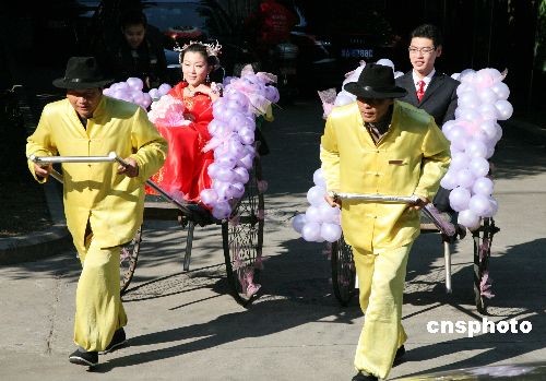 11月11日,江蘇南京的一對新人喜結(jié)良緣,新郎別出心裁地從南京夫子廟請來兩輛黃包車,接新娘進(jìn)門。簡樸環(huán)保型的婚慶方式既富個(gè)性又不失浪漫情調(diào)和時(shí)尚,成為街頭一道獨(dú)特的風(fēng)景。中新社發(fā) 鐘山 攝