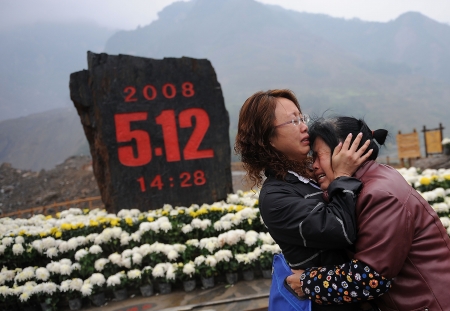 再往上是一個(gè)廣場(chǎng),中心立著三塊大石,排列成一個(gè)大大的“川”字。中間那塊石頭上刻著鮮紅的“5·12 14∶28”,就像人們心中永遠(yuǎn)的痛。廣場(chǎng)一旁,插著一些穿斗式民居構(gòu)架,遠(yuǎn)遠(yuǎn)望去,就像一個(gè)個(gè)靜默的十字架。一名叫董蓉的講解員說,插著構(gòu)架的地方都是傷亡特別集中的地方。一是為了寄托哀思,二是為了紀(jì)念這種川北特有的建筑。穿斗式構(gòu)架房屋是川北一種房屋結(jié)構(gòu),這次地震中,穿斗式結(jié)構(gòu)房屋百分之九十都破而不倒,挽救了很多村民的生命。