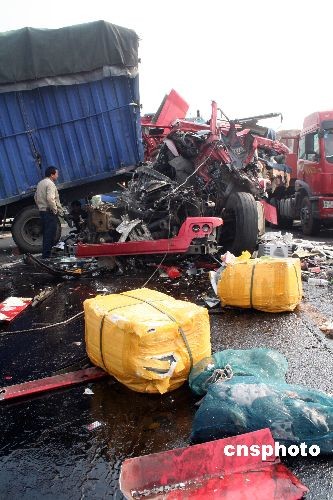 11月14日6時30分,由于受團霧影響,滬昆高速江西東鄉(xiāng)縣195KM--196KM處往南昌方向同時間發(fā)生5起汽車追尾事故,造成16輛貨車追尾,高速公路交通一度受阻。據(jù)了解,事故已造成5人死亡、10人受傷。經(jīng)過當?shù)赜嘘P(guān)部門全力搶救,到上午10時,滬昆高速公路事故路段實行交通疏導分流,恢復部分交通,目前事故還在進一步清理調(diào)查中。中新社發(fā) 何江華 攝