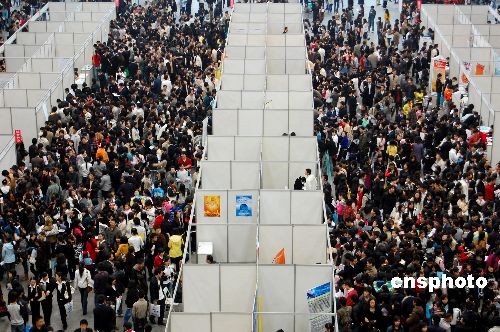 11月15日,由重慶市大學(xué)中專(zhuān)畢業(yè)生就業(yè)指導(dǎo)服務(wù)中心聯(lián)合學(xué)校、企業(yè)與職業(yè)生涯發(fā)展機(jī)構(gòu)等多方力量,共同為09屆的高校畢業(yè)生籌劃舉辦的雙選會(huì)系列活動(dòng),首場(chǎng)也是規(guī)模最大的一場(chǎng)雙選會(huì)在陳家坪展覽中心舉行,萬(wàn)余人次09屆畢業(yè)生參加。 從招聘會(huì)上看到,由于受到全球金融危機(jī)的影響,企業(yè)紛紛“瘦身”,大幅縮減招聘人數(shù),畢業(yè)生面臨“僧多粥少”的局面,就業(yè)遭遇寒流。中新社發(fā) 許康平 攝