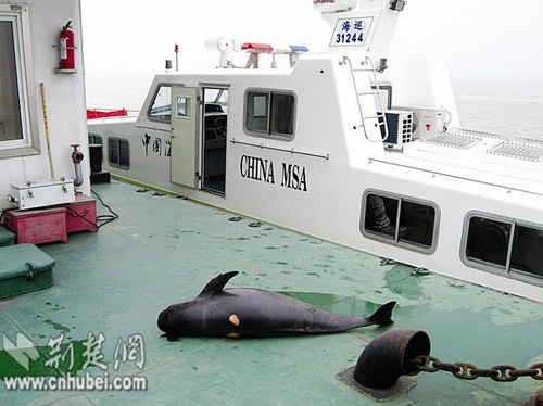 昨日中午,武漢海事局執(zhí)法人員在長江龍口水道巡航時(shí),發(fā)現(xiàn)一具江豚的尸體。嘉魚縣漁政局技術(shù)人員趕來,經(jīng)鑒定,該江豚體長1.45米,重約60公斤,身上有明顯的捕魚器具傷痕,是致其死亡的直接原因。