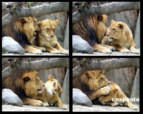 2008年11月18日,上海動物園內(nèi)的兩只獅子在互相依偎取暖。一股較強(qiáng)冷空氣正在氣勢洶洶南下,17日開始影響申城。來自上海氣象部門的消息,這股冷空氣將給申城帶來明顯大風(fēng)降溫,過程降溫幅度6-8℃,19日和20日早晨最低氣溫將跌至5℃左右,有霜或暗霜。中新社發(fā) 井韋 攝
