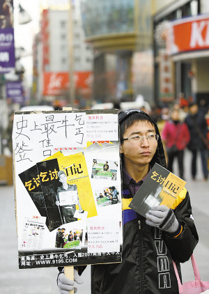 11月18日,長(zhǎng)春市寒風(fēng)凜冽,而在重慶路上卻有這樣一位衣著單薄的人引起過(guò)往行人的注意:他身高約1.7米左右,赤裸的雙腳只靠一雙棉拖鞋阻擋風(fēng)寒,他的右手舉著一個(gè)寫(xiě)著“史上最牛乞丐簽售”字樣的牌子,左手提著一個(gè)粉色布袋子,手中還舉著一本名為《乞討日記》的書(shū),步履蹣跚地行走著。他,就是名噪一時(shí)的“史上最牛乞丐”夏海波。