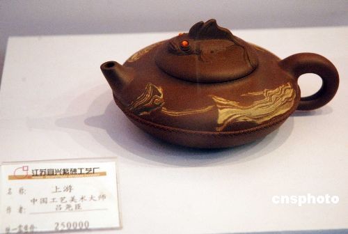 2008年11月18日,福建武夷山第二屆海峽兩岸茶業(yè)博覽會(huì)上,來(lái)自江蘇宜興售價(jià)高達(dá)250000元的天價(jià)紫砂壺吸引了許多紫砂壺愛(ài)好者前來(lái)觀賞。中新社發(fā) 張 斌 攝