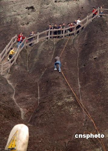 2008年11月17日,福建自然風(fēng)景名勝武夷山每天都吸引許多游客前來游玩,然而許多游人隨手丟棄的旅游垃圾醒目地散落在秀麗的山間上,為了保護(hù)景區(qū)環(huán)境,工作人員只好在高達(dá)800米陡峭的山間中拾垃圾,被游人喻為武夷山上的“蜘蛛人”。中新社發(fā) 張斌 攝