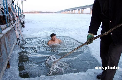 11月20日,哈爾濱公路大橋西側黑龍江省冬泳協(xié)會冰窟池,游泳會長王利敏在冰窟窿里撈冰,準備按計劃鑿開一個長50米,寬20米的冬泳池。中新社發(fā) 姚庭山 攝