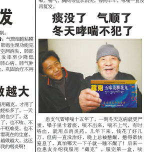“患友介紹我服用了‘藏克’。服完第一盒,咳嗽、胸悶就緩解多了!弊蛱(22日),看著我市(重慶市)某報(bào)上的一則藥品廣告,90歲高齡的老人張治欽感到納悶,“我從來(lái)沒(méi)得過(guò)這病,卻上了該藥的宣傳廣告!