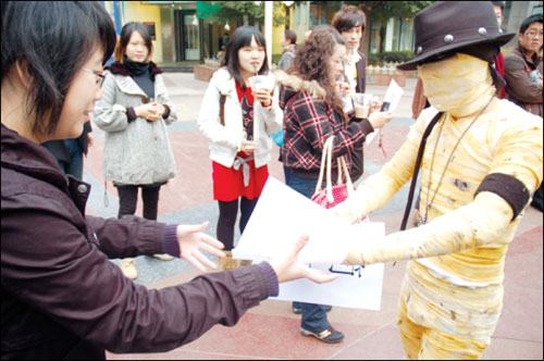 兩名大四學生扮怪相,用行為藝術反映求職難。韓立山 攝