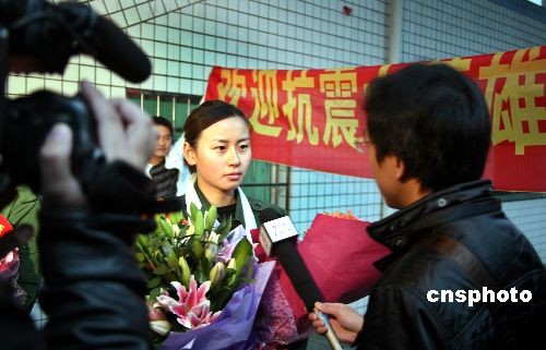 11月26日晨,武警某部貴陽(yáng)籍女警花徐一蝶和楊帆退伍還鄉(xiāng),乘火車從成都回到貴陽(yáng)。親朋好友、同學(xué)和慕名而來(lái)的人群捧著鮮花在月臺(tái)迎接這兩位在汶川大地震中做出突出貢獻(xiàn),立功受獎(jiǎng),并受到溫家寶總理接見的女警花。今年5月14日,徐一蝶和楊帆在救災(zāi)過(guò)程中表現(xiàn)突出,被分別授予二等功和三等功1次。中新社發(fā) 彭年 攝
