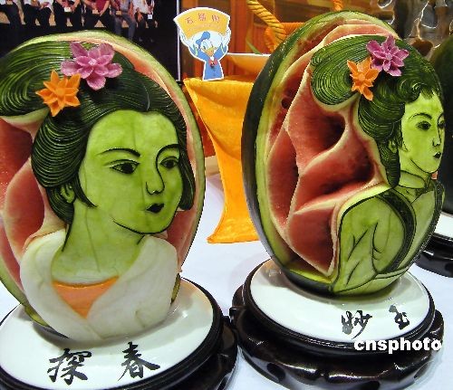 2008年11月27日,上海餐博會(huì)中展出用西瓜雕刻而成的《紅樓夢(mèng)》人物臉譜。中新社發(fā) 井韋 攝