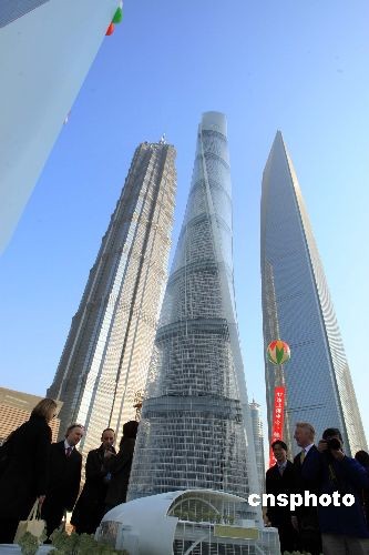 11月29日,中國第一高樓——“上海中心”在上海陸家嘴金融貿(mào)易區(qū)腹地開工,該超高層建筑總高度將達(dá)632米,將與毗鄰的超高層建筑“金茂大廈”、“環(huán)球金融中心”,形成“三足鼎立”美景,圖為開工儀式上,中外嘉賓搶先觀賞這一“上海新景觀”。據(jù)介紹,“上海中心”總投資額預(yù)估高達(dá)148億元人民幣,外觀螺旋造型象征中國和諧的文化精神。預(yù)計(jì)2012年結(jié)構(gòu)封頂且部分投入運(yùn)營,2014年竣工交付使用。中新社發(fā) 潘索菲 攝