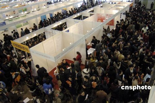11月29日,大型部委聯(lián)合招聘會在北京中國國際展覽中心舉行,中科院、時代集團、中國日報社、百度等700多家單位招攬人才,近萬個工作崗位令求職者趨之若騖。據(jù)悉,金融危機下的就業(yè)形勢不容樂觀,許多應(yīng)屆畢業(yè)大學(xué)生主動降低薪酬期望值,以期盡快就業(yè)。中新社發(fā) 徐曦弋 攝