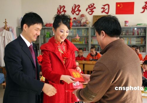 11月29日,身在廣東公安系統(tǒng)工作的梁智、王文星兩位新婚警察夫婦在河北滄州老家舉辦婚禮,他們決定把親友送的婚禮紅包禮金15888元分別捐獻(xiàn)給四川地震災(zāi)區(qū)和滄州市福利保障院的智障兒童。結(jié)婚典禮結(jié)束后,這對新婚夫婦驅(qū)車前往福利院看望兒童,并向當(dāng)?shù)孛裾块T捐獻(xiàn)了自己的結(jié)婚紅包禮金。中新社發(fā) 楊志濤 攝
