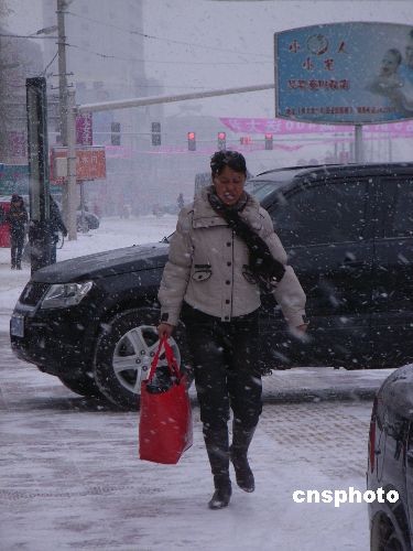 2008年12月3日,齊齊哈爾市再次降雪,城市銀裝素裹。當(dāng)?shù)貧庀笈_發(fā)布藍(lán)色寒潮預(yù)警信號,提醒市民做好預(yù)防寒潮準(zhǔn)備。中新社發(fā) 王云龍 攝