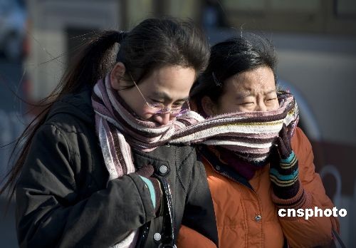 2008年12月4日,入冬以來最強(qiáng)冷空氣入侵北京,街頭兩位女士共用圍巾手套在寒風(fēng)中艱難前行。當(dāng)日,入冬以來最強(qiáng)冷空氣入侵我國大部。中央氣象臺連續(xù)兩天發(fā)布了今年首次寒潮橙色警報,中國氣象局啟動氣象災(zāi)害應(yīng)急預(yù)案Ⅲ級應(yīng)急響應(yīng)命令。中新社發(fā) 王辰 攝