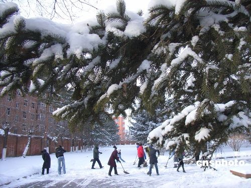 2008年12月4日,齊齊哈爾市再次降雪,城市銀裝素裹。當?shù)貧庀笈_發(fā)布藍色寒潮預警信號,提醒市民做好預防寒潮準備。齊齊哈爾市已經(jīng)連續(xù)兩天降雪,降雪給城市交通帶來了不便,車輛紛紛緩行,市民忙著清掃道路上的積雪。中新社發(fā) 王云龍 攝