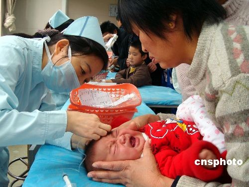 2008年12月4日,蘇州市兒童醫(yī)院的醫(yī)護人員在為患兒輸液。當日,受北方冷空氣影響,蘇州氣溫大幅下降,來醫(yī)院就診的患兒也比平時增加四成左右,大部分患兒是由于受涼而引發(fā)感冒、發(fā)燒等不適。中新社發(fā) 王建康 攝