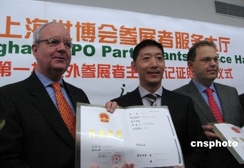 12月5日,中國(guó)2010年上海世博會(huì)首批境外參展者完成主體登記,獲頒證照。此舉標(biāo)志著上海世博會(huì)面向全球的參展服務(wù)啟動(dòng)。圖為荷蘭展區(qū)總代表魏偉勵(lì)(左一)、盧森堡展區(qū)副總代表費(fèi)瑞朋(右一)等從上海官員手中接過(guò)營(yíng)業(yè)執(zhí)照等。中新社發(fā) 許曉青 攝
