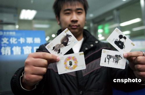 12月6日,北京市地鐵運營公司開始發(fā)行4000冊紀(jì)念文化卡票,每冊280元,這是北京軌道交通運營38年來首次發(fā)行紀(jì)念文化卡票。除機場線4個站外,北京地鐵7條線的119個站點將同時發(fā)售紀(jì)念卡票。紀(jì)念卡票特邀韓美林擔(dān)綱設(shè)計,冊內(nèi)收藏北京地鐵紀(jì)念文化卡票4張,設(shè)計以“奧運與地鐵”文化創(chuàng)意為主線,選農(nóng)歷戊子年“鼠”為首頁,以“熊貓、耕牛、駿馬”為圖,分別呈現(xiàn)“和諧、平安、耕耘、開拓”。中新社發(fā) 富田 攝