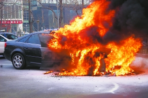 據(jù)車(chē)主楊先生說(shuō),他駕車(chē)從西四環(huán)行至花園橋時(shí)就聞到一股異味,本想把車(chē)停至輔路查看一下,可剛開(kāi)到輔路出口處,車(chē)前部已開(kāi)始冒煙起火。過(guò)往司機(jī)紛紛停車(chē)拿出車(chē)上的滅火器幫忙滅火,卻無(wú)濟(jì)于事。不一會(huì)兒就聽(tīng)到一聲巨響,瞬間車(chē)身就被大火籠罩。