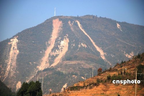 12月,在四川青川縣關(guān)莊鎮(zhèn)的白石河停車(chē)場(chǎng)可以清晰地看到遠(yuǎn)山滑坡體垮出的“青川”二字。中新社發(fā) 熊芙蓉 攝